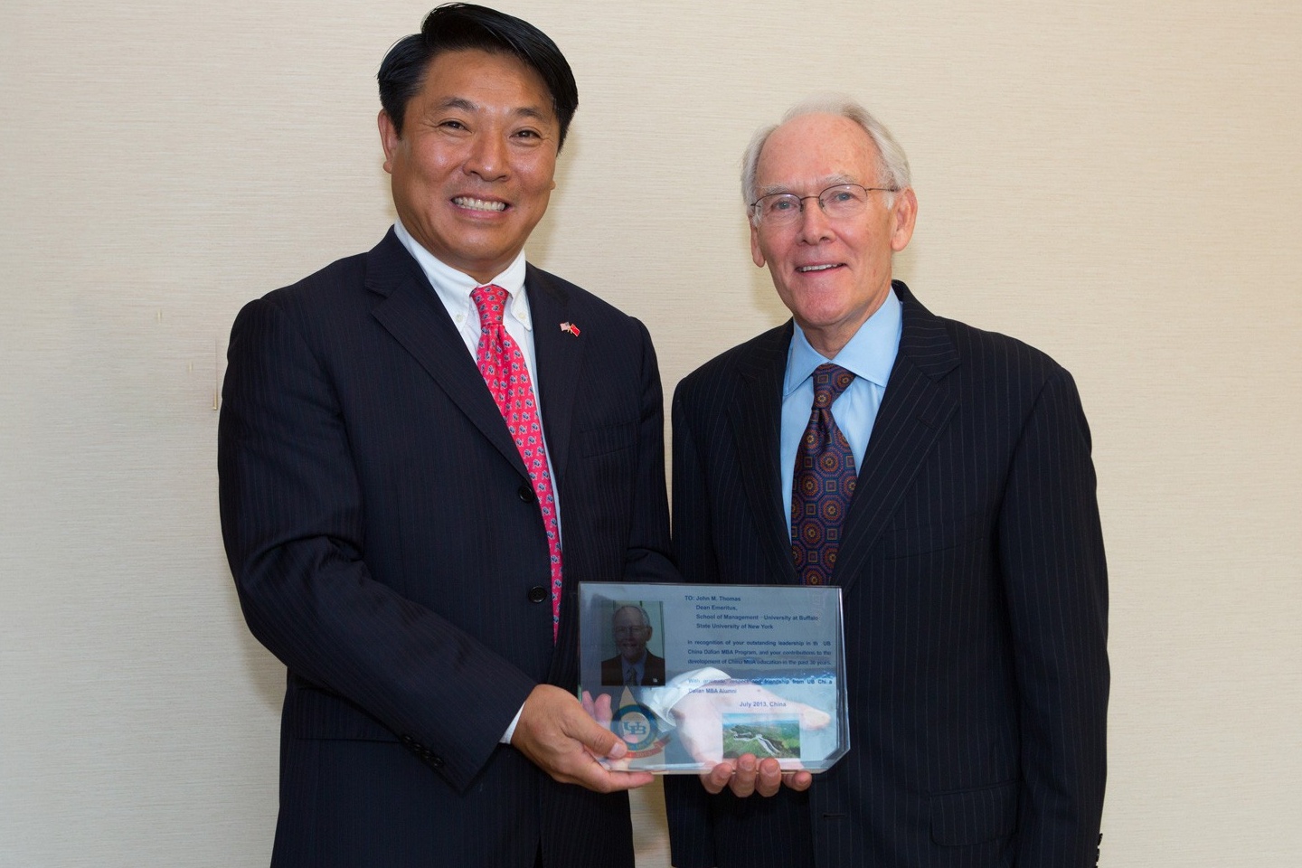 "With gratitude, respect and friendship, we Dalian MBA alumni are honored and proud to present this award to Dean Emeritus John Thomas in recognition of his outstanding leadership in UB's Dalian MBA program and his contributions to the development of China MBA education over the past 30 years," said Dong, who is a 2012 China Economy Top 10 Business Leader and serves on the School of Management Dean's Advisory Council. "China is grateful to UB and will remember those who helped China to start MBA education."