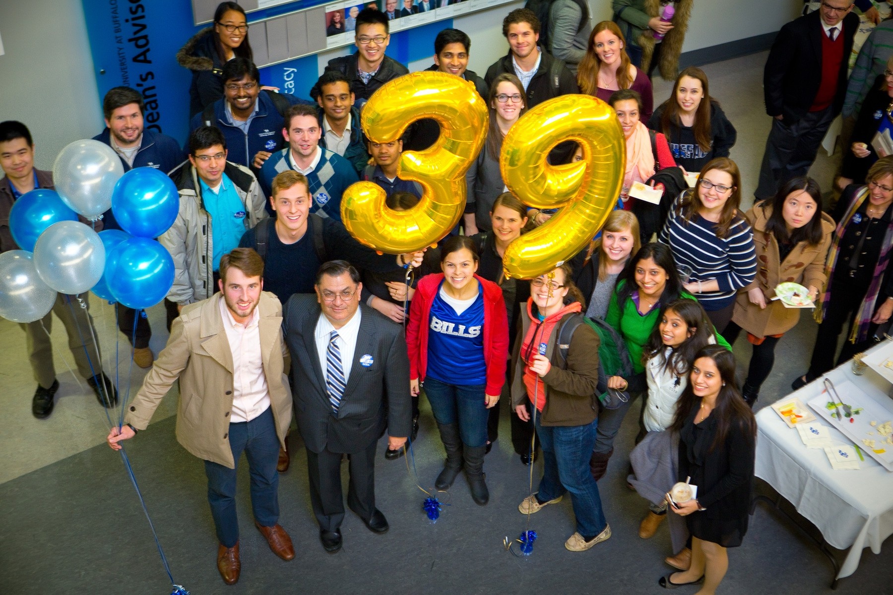 Dean Arjang Assad celebrates the School of Management's top 40 Bloomberg Businessweek MBA ranking with students, faculty and staff at a reception in the Alfiero Center (Photo: Douglas Levere)